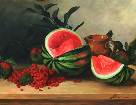 Но в начале, конечно же, много подробной теории, о том какие материалы, выбрать, как правильно смешивать краски, какие существуют законы композиции, как показать объемы, светотеневые градации, создать гармоничный колорит. И, безусловно, много практики: натюрморты, пейзажи, тематические композиции.
